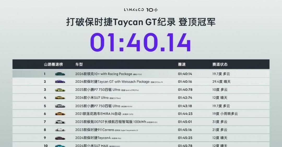 领克10+本次发布的核心亮点来自赛道表现。在官方性能套件加持下(包括可调碳纤维大尾翼、21英寸锻造轮毂、BREMBO竞技刹车系统等),该车型以1分40秒14完成亚洲山脊赛道计时挑战,官方声称该成绩超越保时捷Taycan GT同场测试数据,拿下"亚洲山脊赛道圈速第一"。